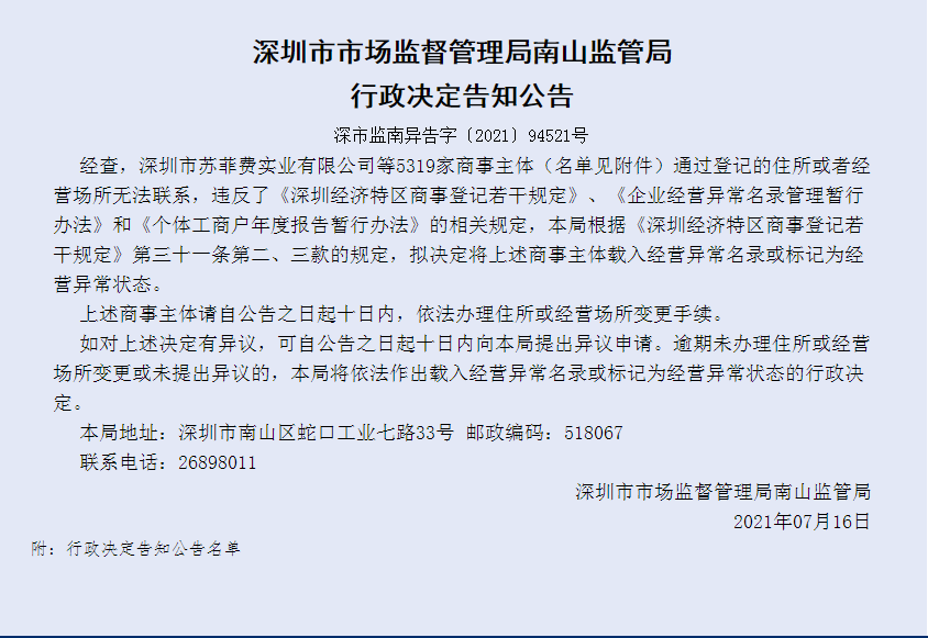 最近,工商局在大面积的抽查注册地址,在7月16日,仅南山区就有5000多家公司被抽查地址(见下图)。抽查的方式包括但不限于:1、直接上门;2、通过邮政派送信函。故此,鸿兴商务提醒您:近期一定要注意接深圳的座机或手机号码,如果是广告挂了就行!如果没接地址会直接异常的!千万要注意!使用我司挂靠地址的,接到派送邮件人员的电话,要告诉对方,地址没错,但是自己没在公司,找人帮忙签收信件,完了,及时联系我们,将单号及快递员的电话号码告诉我们。