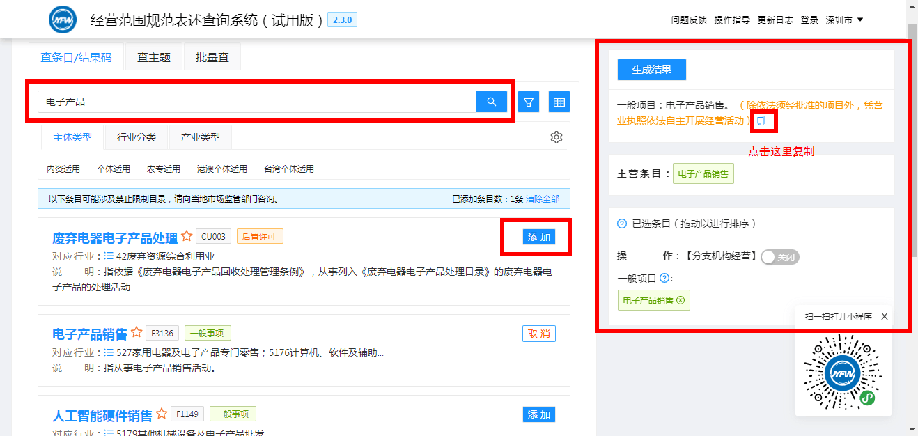 第三步,出来的搜索列表里,选择自己想要的经营范围,点击“添加”,重复搜索操作,将所有自己想要的经营范围,添加完成后,会出现在右侧,有个小的“复制”图标(如图),点击复制,然后把所有经营范围复制出来。这样,在注册录系统的时候,就可以按照所选的经营范围逐一选择了。