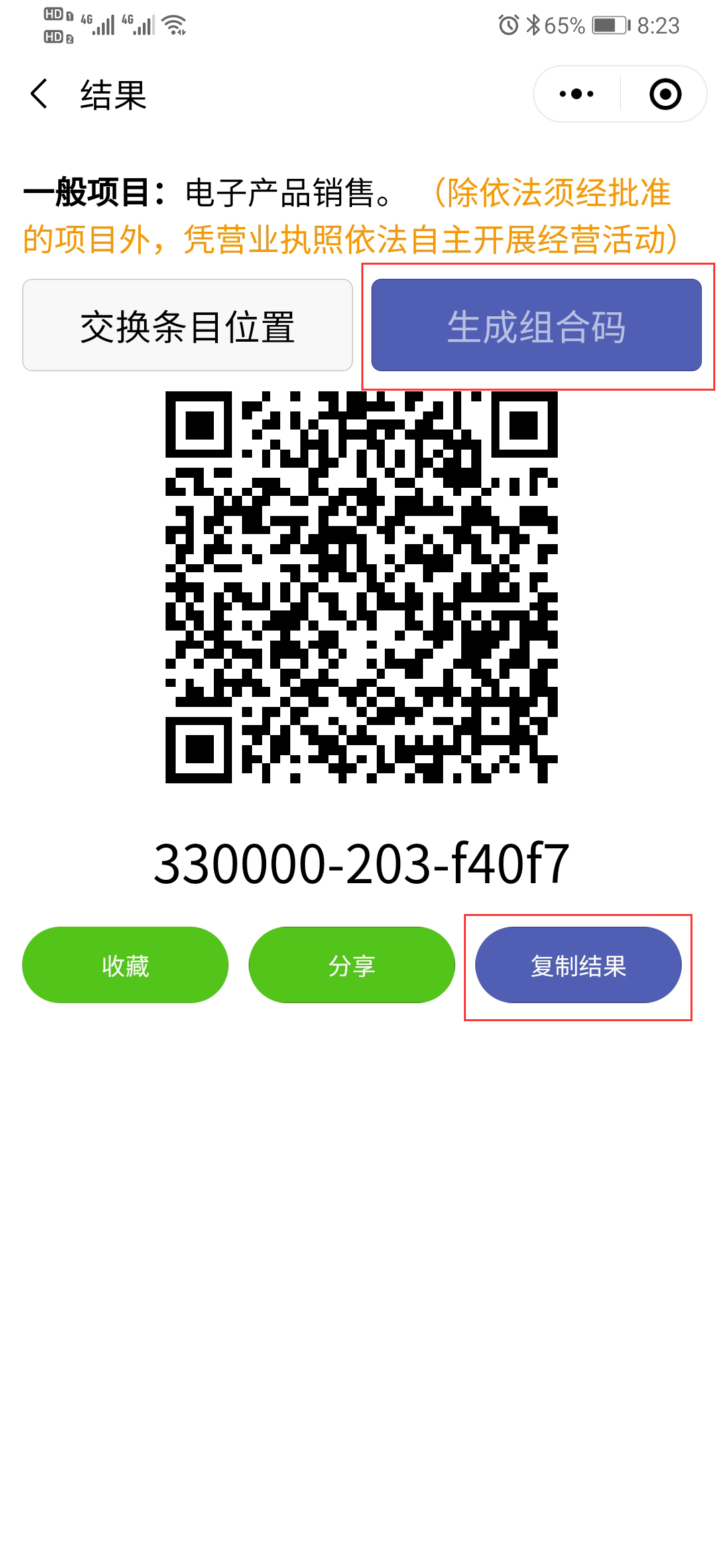 第四步,接第三步,会看到,“生成组合码”这几个字,点“生成组合码”,会提示登录,直接微信登录,完了再生成。生成后,点击下方的“复制结果”,将经营范围复制出来。